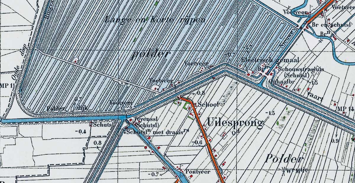 Op deze plek doorsnijdt het Polderhoofdkanaal, aangelegd in 1875 om turf te vervoeren van Gorredijk naar de Wijde Ee in het noorden, het Koningsdiep. Het Polderhoofdkanaal vormt onderdeel van de Turfroute.